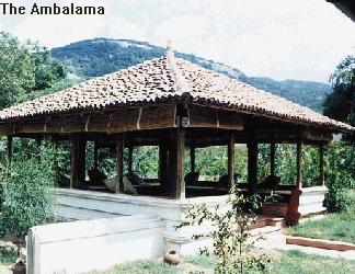 The village owes its name, which means ‘water spring’, to the perennial stream running through the land. According to legend, a group of andis or travelling mendicants from India were the first settlers at Ulpotha many centuries ago. They sang and danced as they travelled through Lanka in search of God Kataragama. When they broke journey at Ulpotha for the night, the seven hills, the jungle and the reservoir convinced them that it was Kataragama. In his dreams that night, the head priest saw a vision of God Kataragama, who showed him how to perform a puja. The andis thus settled there and built a devale to God Kataragama at the entrance to the village. Each year a perahera is conducted from this temple. Our visit to Ulpotha was a most interesting experience. A rough gravel track led to the village. At the entrance was a wattle and daub cadjan roofed building or wahalkada. All vehicles stopped here and progress beyond this was by foot. Another wattle and daub building beyond consisted of an outer sitting area with doors opening off it. The walls and floors were of smoothened clay. On three sides of the room, low built-up seats of clay were spread with woven rush mats and scattered with cotton cushions. Kerosene oil lamps hung from the beams of the roof while an old brass oil lamp stood in a corner. Cottages for the families working there, a kitchen and toilet all in wattle and daub and shower facilities complete the outer complex, separated from the rest by the stream.